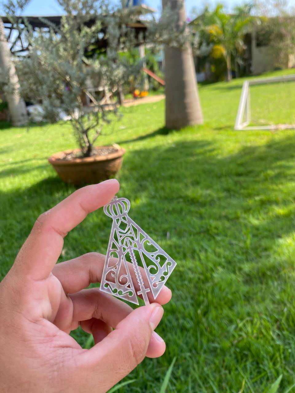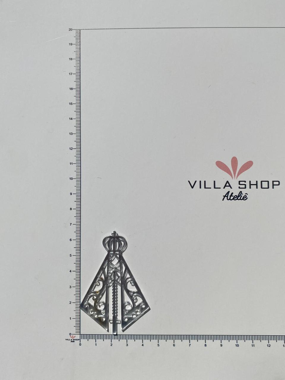 mini Nossa Senhora Aparecida vazada em acrílico espelhado prata.tamanho: 6,5×4,5cm